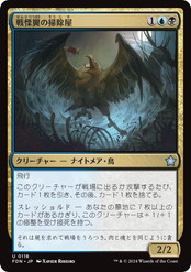 | 血に飢えた征服者 Bloodthirsty Conqueror | ![]() | 7.5 | シンプルにスタッツと能力が強力である。ただし除去耐性は皆無のため注意。本カード単体では、プレイヤーダメージ専用の絆魂を持っている感じである。なお、黒の[略奪する破戒僧]と並べることで、どちらかが誘発した時点で無限ルートに入り勝利可能。(ライフを得る、相手がライフを失う、を繰り返す) | 黒 | 5 | 神話 | 5 | 5 | クリーチャー | 吸血鬼, 騎士 | - | 接死, 飛行 |