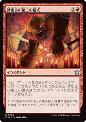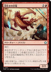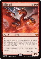 | 双炎の暴君 Twinflame Tyrant | ![]() | 8 | ざっくり言えば、クリーチャーのパワーを2倍にしつつ、さらに火力ダメージも2倍にするカード。そのため、実質スタッツは6/5といえる。除去耐性はないもんの、戦場に出た時点ですぐに戦況を変えられるボムカードである。 | 赤 | 5 | 神話 | 3 | 5 | クリーチャー | ドラゴン | - | 飛行 |