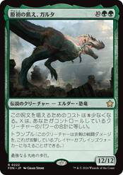 | 原初の飢え、ガルタ Ghalta, Primal Hunger | ![]() | 5.5 | トランプルのおかげで、除去必須のカードだが、逆にいえば除去耐性は何もない。リミテッドにおいては割と安定してプレイ可能である。 | 緑 | 12 | レア | 12 | 12 | クリーチャー | エルダー, 恐竜 | 伝説 | トランプル |