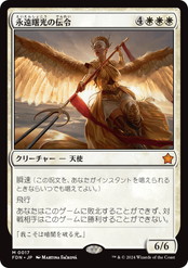 | 永遠曙光の伝令 Herald of Eternal Dawn | ![]() | 6 | 強力なスタッツと飛行、瞬速持ちと強力だが、7マナと重い。また、能力自体は勝ちに直接つながるとはいえず、他の神話レアに比べると少し見劣りする。シンプルな大型クリーチャーとして捉える方が良い。相手の全体修正による一斉攻撃などに合わせられると気持ち良いが、やはり7マナがネックになる。 | 白 | 7 | 神話 | 6 | 6 | クリーチャー | 天使 | - | 瞬速, 飛行 |