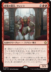 | 群衆の親分、クレンコ Krenko, Mob Boss | ![]() | 7.5 | 即除去が必須のシステムクリーチャー。特に全体強化の支援もなく、数ターンで凄まじい数のトークンを生成できる。 | 赤 | 4 | レア | 3 | 3 | クリーチャー | ゴブリン, 戦士 | 伝説 | - |