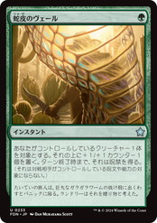 | 針羽の大ワーム Quilled Greatwurm | ![]() | 7.5 | ざっくり言えば、戦闘したクリーチャーに、そのパワー分の+1/+1カウンターを置くカード。説明の通り、生き残る必要があるのは当然である。ただし、先制攻撃や二段攻撃を持っていれば、先制フェーズのダメージの時点でカウンターが乗る点には留意したい。拮抗した戦場がひっくり返るカードではないが、1回動き出すと止められないボムカード。 | 緑 | 6 | 神話 | 7 | 7 | クリーチャー | ワーム | - | トランプル |