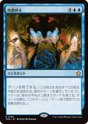 | 時間停止 Time Stop | ![]() | 6 | 小難しいカードだが、パターンを抑えて置けば良い。概ね利用パターンとしては、①相手ターンのアップキープ時②相手ターンに何か唱えたとき③自分ターンに相手が除去や瞬速を使ったとき、である。①が鉄板であり、相手のドローはさせずに擬似的に追加ターンのように働くが、土地を含めてアンタップはされてしまうため、インスタントを使われるリスクはある。②は擬似的な打ち消しとして働くが、相手にドローも許してはいる③も擬似的な打ち消しで、この使い方は明らかに弱いが、レアカードなどを守る目的なら使って良いだろう。基本的には①で追加ターン的な運用で使いたい。 | 青 | 6 | レア | インスタント | - | - | - | ||