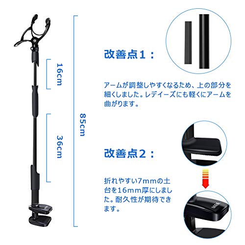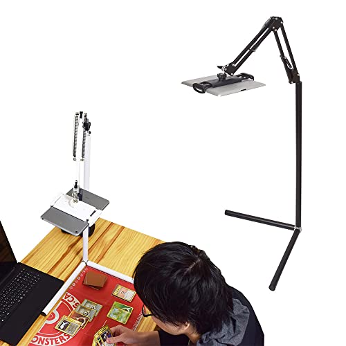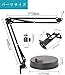 スマホをカメラとして使うとき、「テーブルの上にスマホ(カメラ)を固定する」には、スマホやタブレット用のアームを使うと簡単でしょう。世の中的に、Webカメラ用のアーム製品は非常に数が少ない一方、スマホ用のアームは比較的入手が容易です。アームには画像のように机に置くタイプもあれば、机に挟んで固定するタイプなどさまざまあります。机に置く場合、挟む場合どちらでも、ご自分の机のサイズ、挟む幅などを確認した上でアームを購入するようにしましょう。