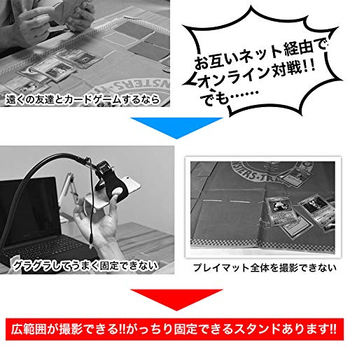 カメラとしてスマホを使う場合は、上記のようなアームで固定するのが一般的です。アームを使ってテーブルの上にスマホを配置することで、カードを投影することができます。リモート対戦のときだけではなく、日常的にも使える製品ですので、1個持っておくと便利です。ベッドの近くにアームをとりつけて、寝ながら手を離してスマホやタブレットを見るときに使う用途が多いですね。アームも価格帯により性能が異なり、節点(アームで曲がる関節)の数や、スマホの固定のしやすさ、横方向・縦方向の可動域などの違いがあります。予算に余裕があれば3000~4000円代のアームをオススメしますが、お試しとしては安価のアームでも十分機能しますのでそちらでも構わないでしょう。
